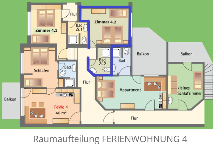 Im Zimmer 4.2 ist ein Doppelbett und ein Einzelbett vorhanden. Es verfügt über einen eigenen Sanitärbereich.